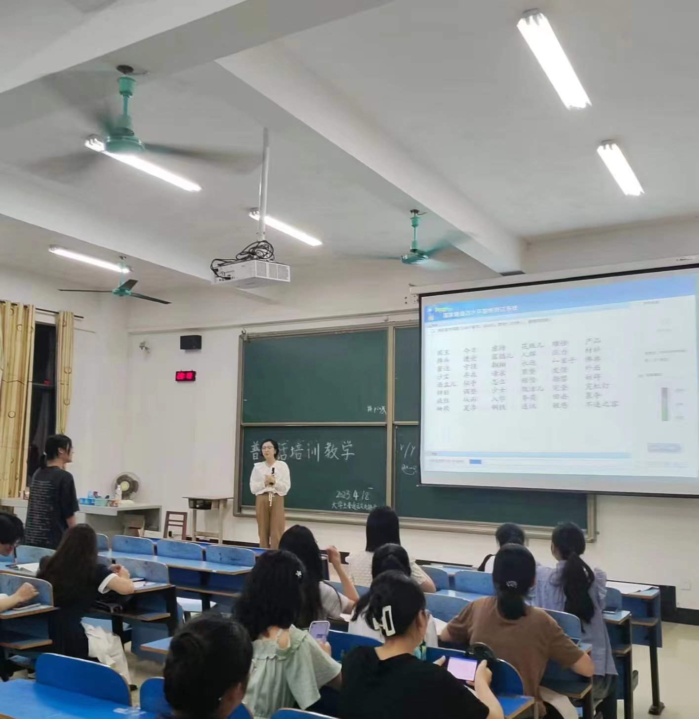 韦丽老师采用理论与实践相结合的教学方式进行培训,鼓励同学们多张嘴练习。在课堂上,特别注重同学们的发音情况,通过观察嘴型来纠正发音,要求同学们在发音的过程中感受舌头的位置和气流的变化,为参加培训的同学准备普通话考试提供了有效的指导。
