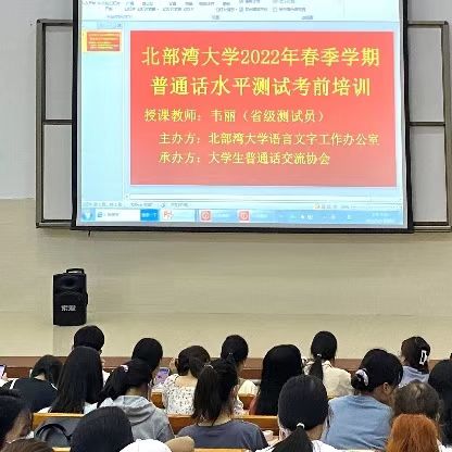 2022年5月8日晚,在13-208教室成功举办北部湾大学2022年春季学期普通话水平测试考前培训,特别邀请我校省级普通话测试员、学生工作处资助工作科韦丽科长为参加培训的二百余名同学进行讲解答题技巧和注意事项。
