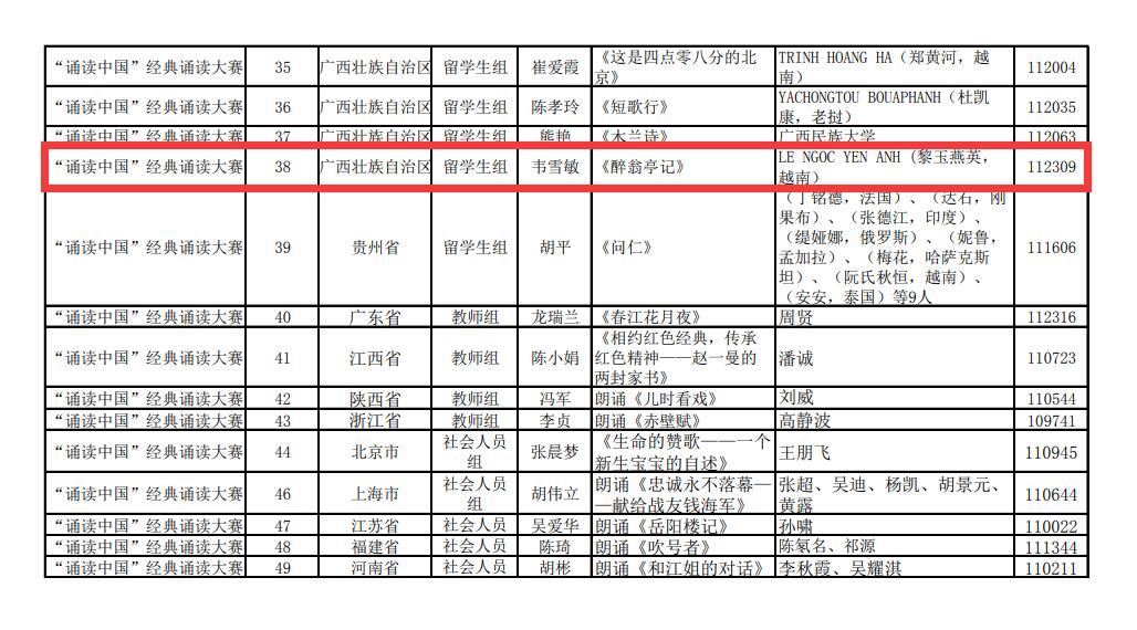 第二届中华经典诵写讲大赛“诵读中国”经典诵读大赛留学生组获奖名单(部分)