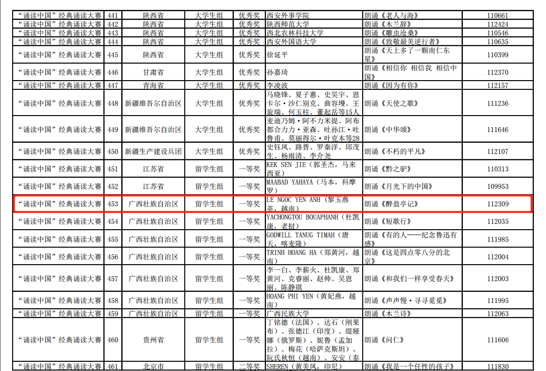 第二届中华经典诵写讲大赛“诵读中国”经典诵读大赛留学生组获奖名单(部分)