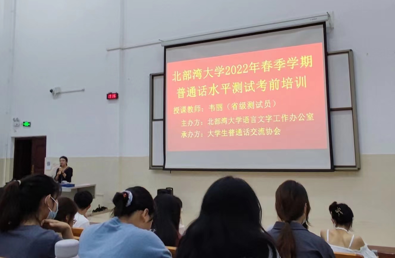 2022年5月8日晚,在13-208教室成功举办北部湾大学2022年春季学期普通话水平测试考前培训,特别邀请我校省级普通话测试员、学生工作处资助工作科韦丽科长为参加培训的二百余名同学进行讲解答题技巧和注意事项。
