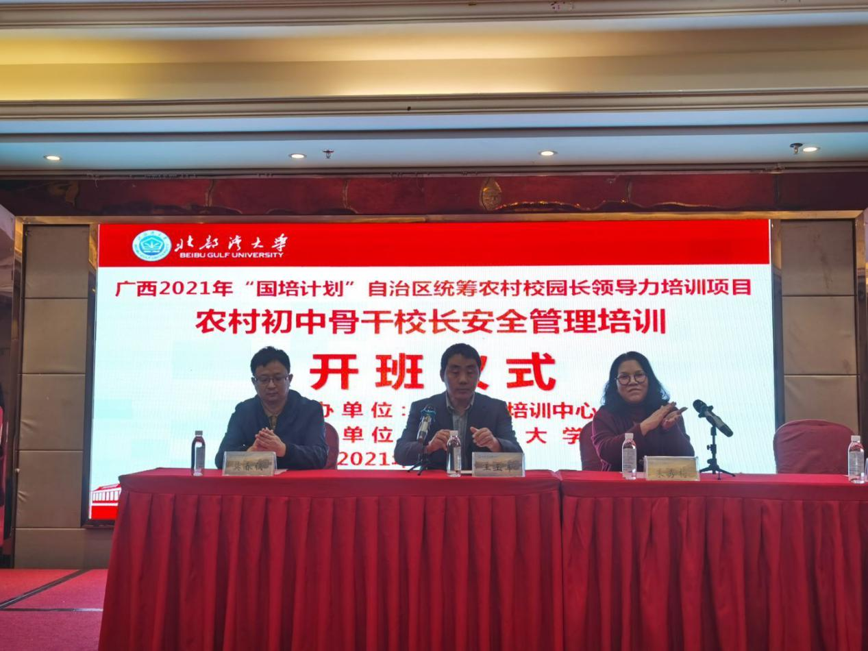 2021年12 月 8 日,根据自治区疫情防控指挥部及自治区教育厅教师培训中心有关工作要求, 北部湾大学2021 年“国培计划”自治区统筹项目农村校园长领导力培训——农村初中骨干校长安全管理培训班(第一期)正式开班。北部湾大学教务处副处长王玉军博士,项目学科负责人朱秀梅副教授、国培项目办负责人莫春镝以及培训班班主任陆璇璇副教授出席开班仪式,王玉军博士致辞。 北部湾大学2021 年“国培计划”自治区统筹项目农村校园长领导力培训——农村初中骨干校长安全管理培训班(第一期)全体学员参加了开班仪式。