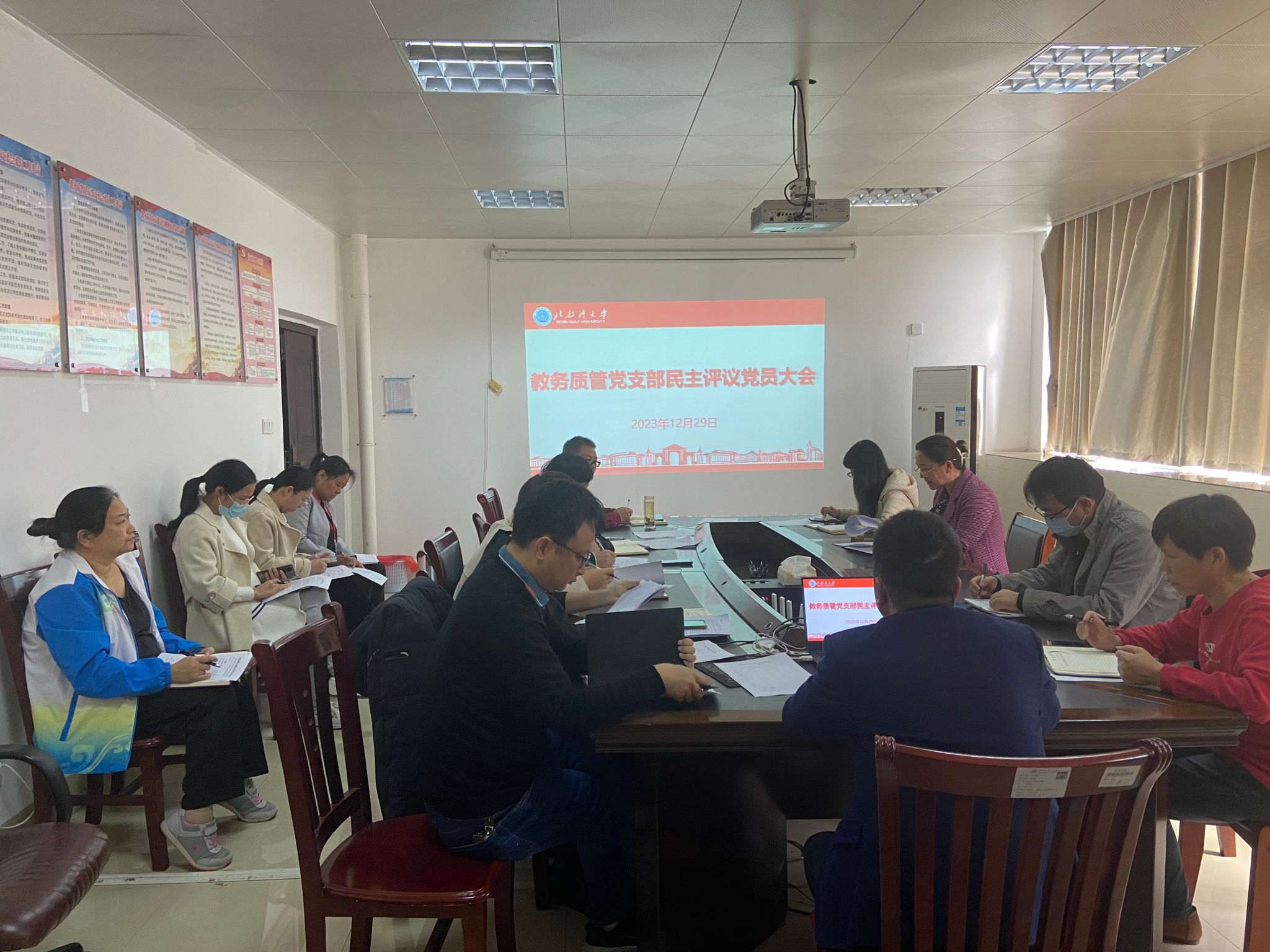 2023年12月29日下午,教务质管党支部在行政楼201会议室开展2023年度民主评议党员活动,会议由党支部书记王柏玲同志主持。