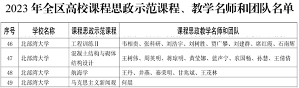 近日,自治区教育厅公布了2023年全区高校课程思政示范课程、课程思政教学名师和团队、课程思政示范基层教学组织名单。我校韦相贵老师教学团队的《工程训练Ⅱ》、王树伟老师教学团队的《混凝土结构与砌体结构设计》、王丹老师教学团队的《航海学》以及何晨老师教学团队的《马克思主义新闻观》4门课荣获评自治区级课程思政示范课程,成员和团队获评课程思政教学名师和教学团队;钟其鹏老师带领的“中国海洋文学教学团队”和史忠丰老师带领的“物理化学课程组”获评自治区级课程思政示范基层教学组织。