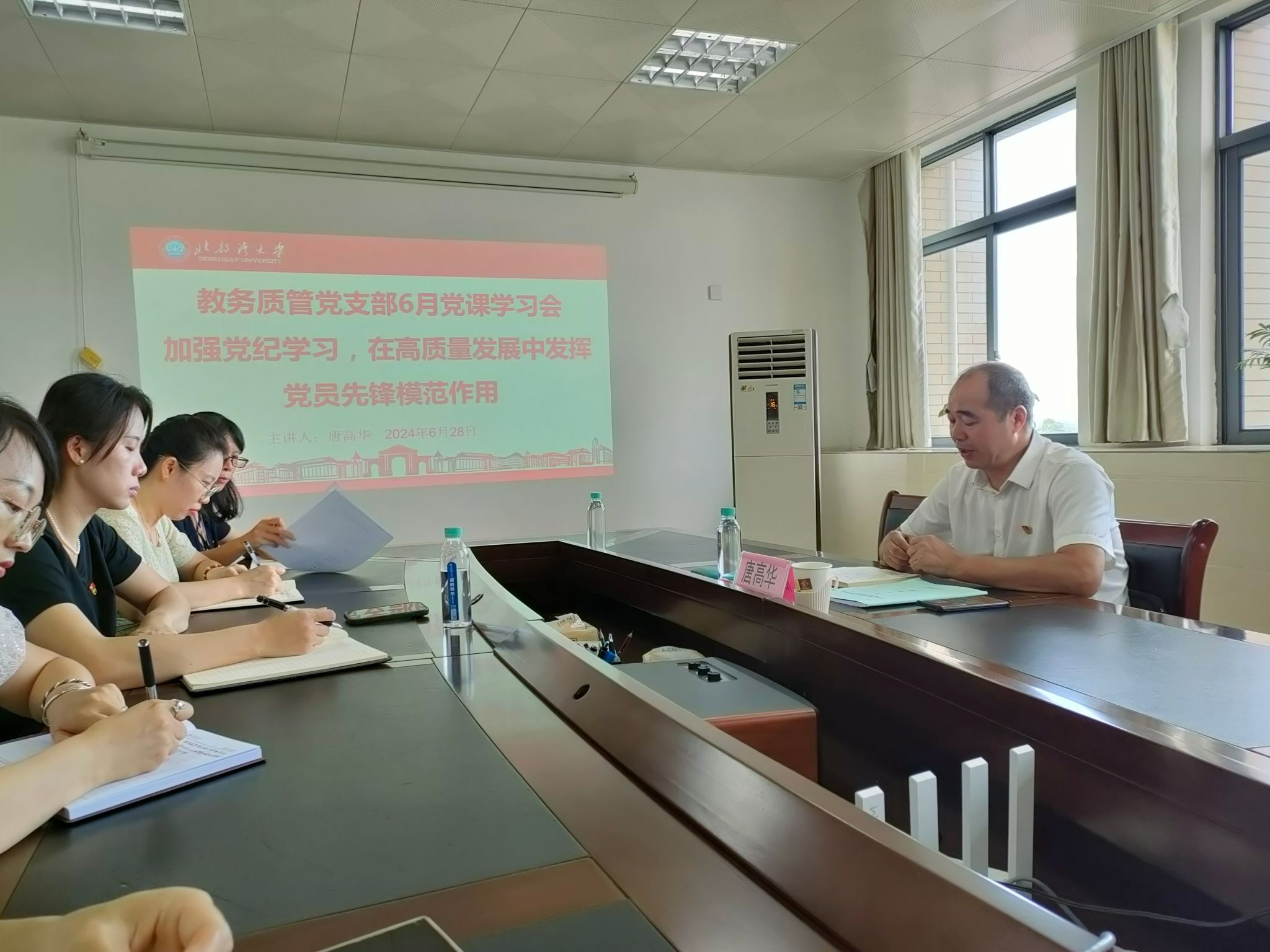 为深入学习贯彻《中国共产党纪律处分条例》,6月28日上午,校党委副书记唐高华以“加强党纪,在高质量发展中发挥党员先锋模范作用”为题讲授专题党课。支部全体党员、入党积极分子参加,教务处其他老师列席参会。