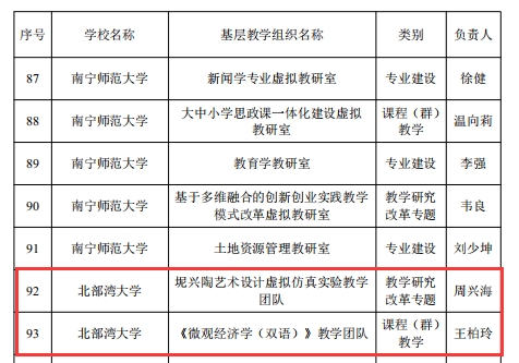 近日,自治区教育厅办公室公布了2024 年自治区级普通本科高校基层教学组织名单,我校经济管理学院王柏玲教授作为负责人的“《微观经济学(双语)》教学团队”和陶瓷与设计学院周兴海副教授作为负责人的“坭兴陶艺术设计虚拟仿真实验教学团队”获得自治区级普通本科高校基层教学组织称号。