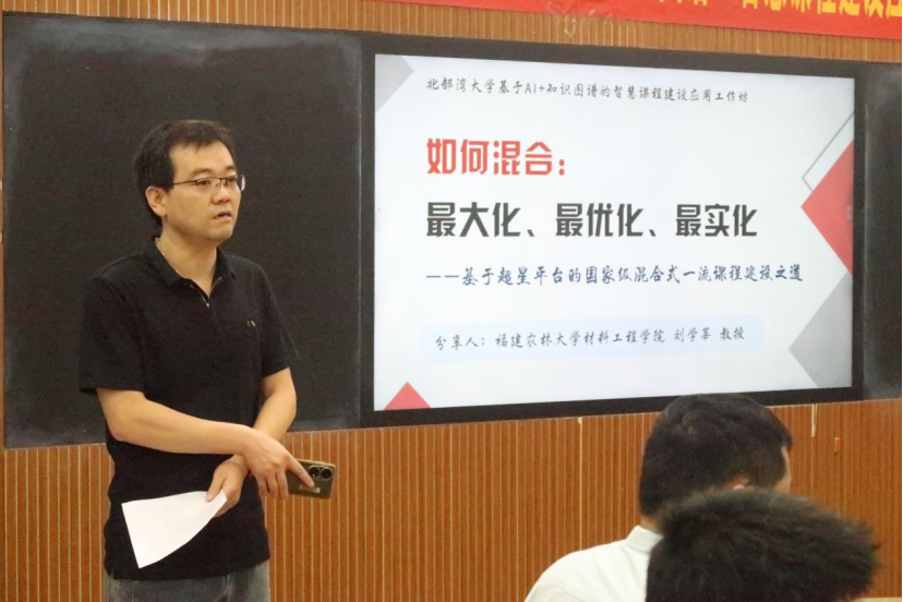 本次工作坊特别邀请了福建农林大学刘学莘教授担任主讲。刘教授在智慧课程建设和教学改革方面经验丰富,曾主持多项国家级一流课程。在上午的课程中,刘教授以“如何混合:最大化、最优化、最实化——基于超星平台的国家级线上线下混合式一流课程建设之道”为主题,深入讲解了混合式课程的内涵、建设标准及智慧课程的创新实践路径。他结合实际案例进行细致分析,参训教师积极参与互动,现场气氛热烈。