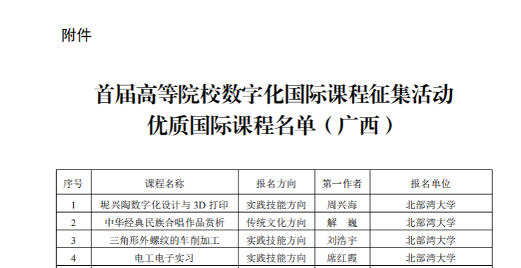 近日,由教育部指导、数字化学习技术集成与应用教育部工程研究中心主办的首届高等院校数字化国际课程征集活动圆满落下帷幕。经过为期数月的激烈角逐和专家评审团的严格评审,我区入选的104门课程中,我校周兴海老师的《坭兴陶数字化设计与3D打印》、解巍老师的《中华经典民族合唱作品赏析》、刘浩宇老师的《三角形外螺纹的车削加工》和席红霞老师的《电工电子实习》四门优质课程名列其中。