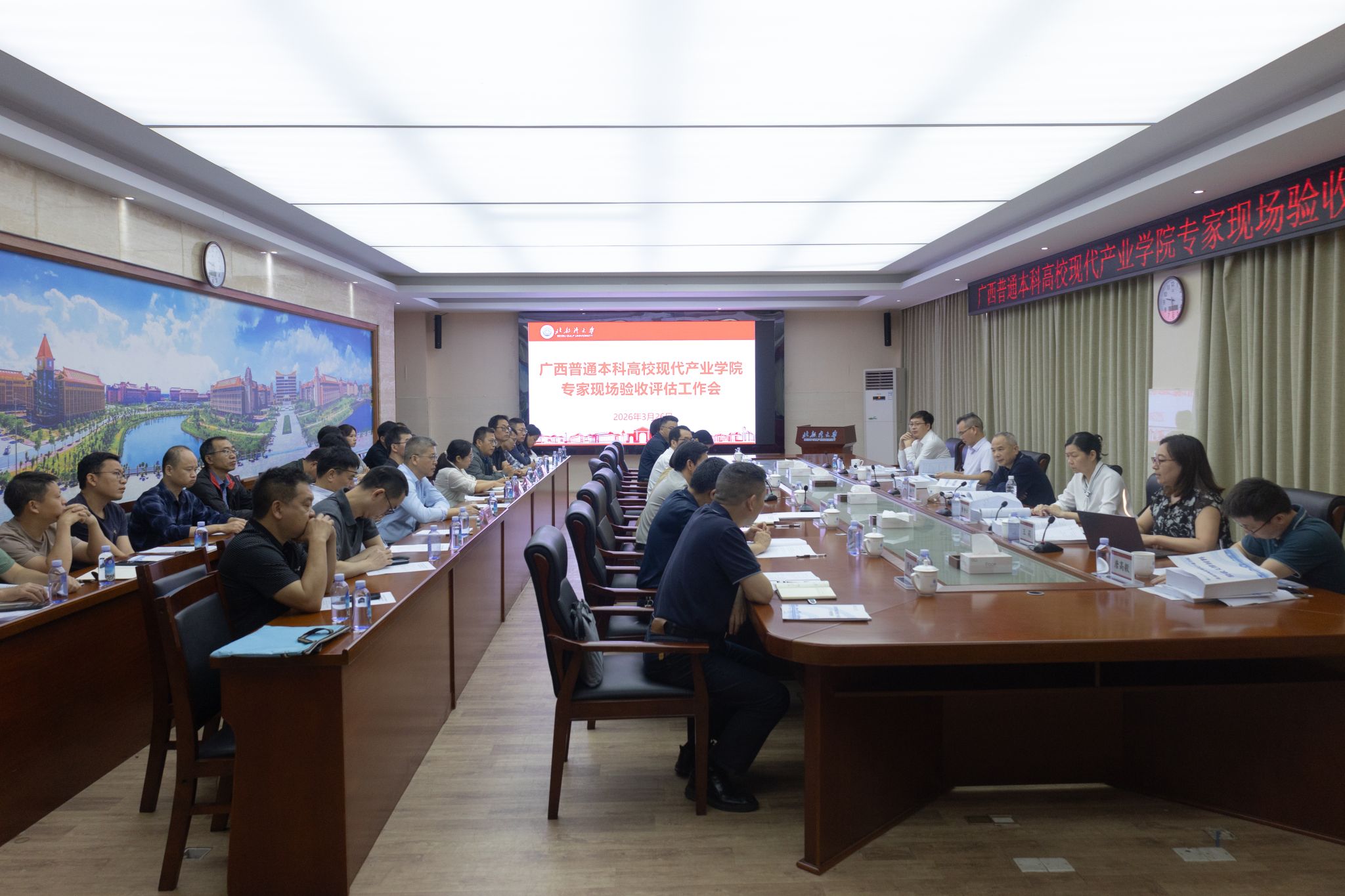 3月26日上午,广西普通本科高校现代产业学院验收评估专家组组长、广西师范大学副校长李先贤一行到校,对我校自治区级示范性现代产业学院开展现场验收评估。校党委常委、副校长陆衡出席工作汇报会并致辞,副校长尹艳镇主持会议。学校党政办、教务处、财务处、国资处等相关部门负责人,产业学院负责人、师生代表及企业代表参加会议。