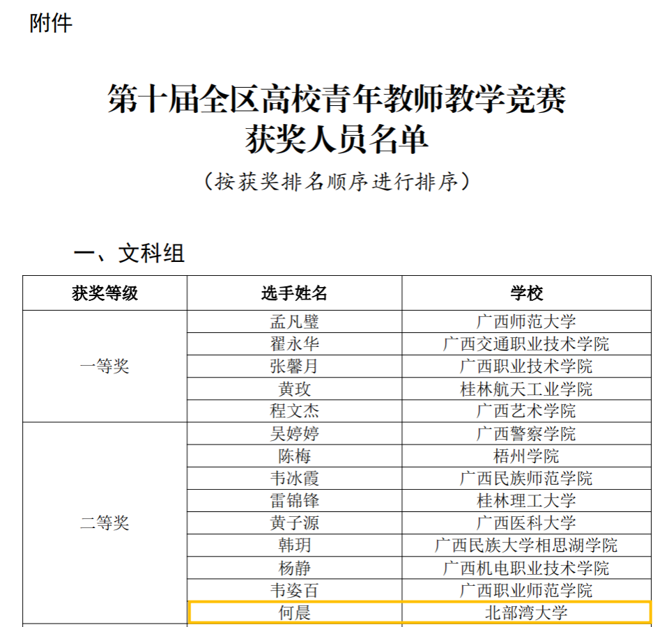 近日,第十届全区高校青年教师教学竞赛获奖名单正式公布,我校共有四名教师获奖。其中人文学院何晨老师荣获文科组二等奖,理学院欧玉芹老师荣获理科组三等奖,建筑工程学院张蕾蕾老师荣获工科组三等奖,马克思主义学院颜文娟老师荣获思政组三等奖。
