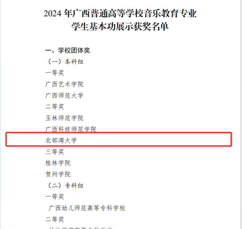 近日,广西壮族自治区教育厅公布了2024年普通高等学校音乐教育、美术教育专业学生及教师基本功展示获奖名单。我校师生表现优异,在团体赛、个人全能赛及多个单项赛事中摘得荣誉,充分彰显了学校在美育教育领域的综合实力与人才培养成果。