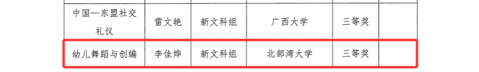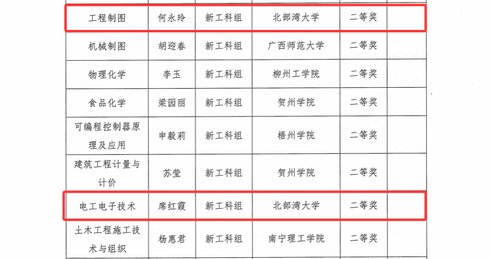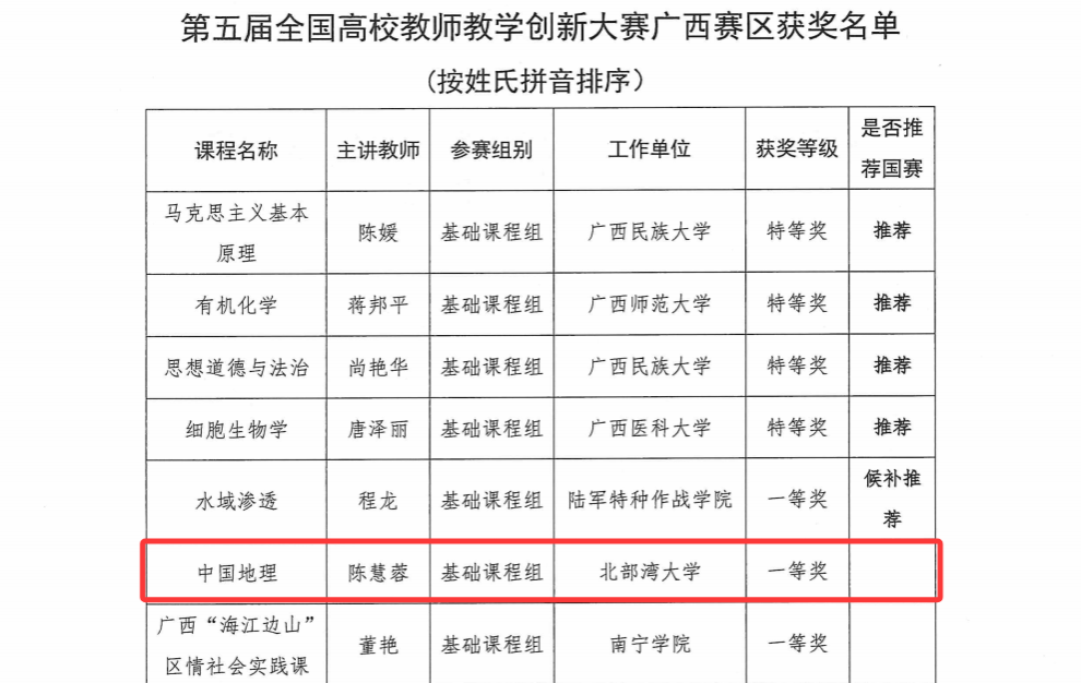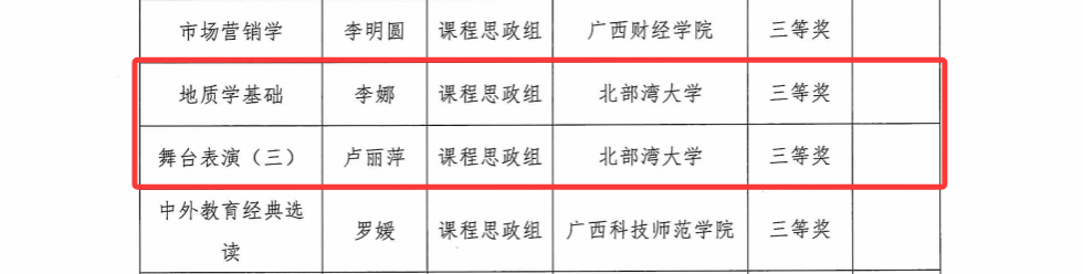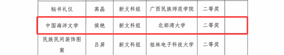 近日,第五届全国高校教师教学创新大赛广西赛区比赛获奖名单正式公布,我校共有10个教师(团队)参赛,9个教师(团队)获奖。其中,资源与环境学院陈慧蓉获基础课程组一等奖、李娜获课程思政组三等奖,机船与船舶海洋工程学院何永玲、席红霞均获新工科组二等奖,人文学院侯艳获新文科组二等奖,音乐舞蹈学院解巍获产教融合组二等奖、卢丽萍获课程思政组三等奖,教育学院李佳烨获新文科三等奖,海洋学院李伟峰获产教融合组三等奖。展现出我校教师在教学过程中不断挑战自我、勇于创新的强大正能量,为教师教育教学创新提供了良好的典范。
